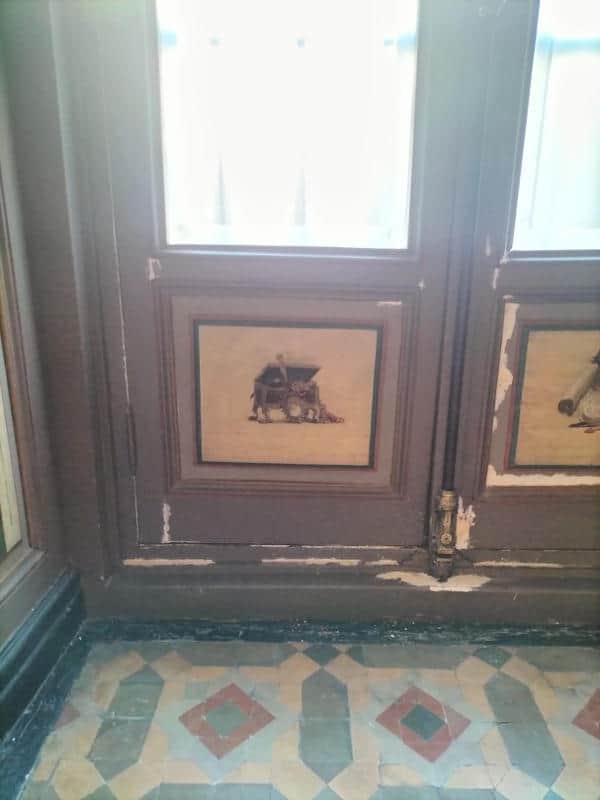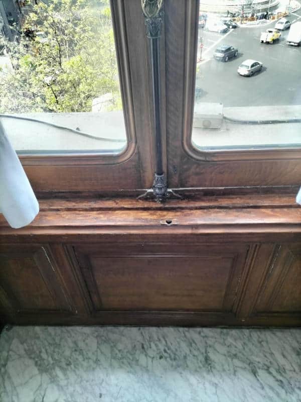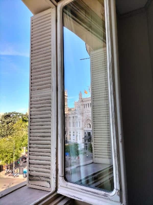 En la plaza de Cibeles, el Palacio de Linares se alza como una de las residencias nobiliarias más representativas del Madrid finisecular: iniciado en 1877 como casa de los Marqueses de Linares y concluido decorativamente hacia 1900, responde al gusto ecléctico del siglo XIX, con proyecto ligado a Carlos Colubí y diseños atribuidos a Adolf Ombrecht, y un despliegue interior donde conviven artes decorativas, pintura mural y programas historicistas—entre ellos, referencias “pompeyanas” que evocan la Antigüedad recreada en clave moderna. Desde 1992, el edificio es sede de Casa de América, consolidando su papel como espacio institucional y cultural entre España y el ámbito iberoamericano. En este marco, la intervención de El Barco se centró en tres ventanales exteriores de madera de pino en la planta superior (dos en oficinas y uno en la galería Pompeyana), cuyo estado era deficiente por exposición directa a intemperie: deshidratación del soporte, pintura cuarteada, levantamientos y pérdidas de policromía e imprimación, molduras con grietas y saltados, además de suciedad superficial e incrustaciones puntuales. La metodología se estructuró en fases: desmontaje cuando fue necesario con protección de áreas colindantes, limpieza, retirada mecánica de recubrimientos inestables y lijado, sellado de intersticios con resina epoxi Axson®, imprimación acrílica al agua y policromado con tres manos sucesivas de pintura acrílica lacada, respetando el color original, para finalizar con el montaje y ajuste en su posición. El resultado devuelve continuidad visual, estabilidad material y lectura arquitectónica coherente con la dignidad representativa del edificio.