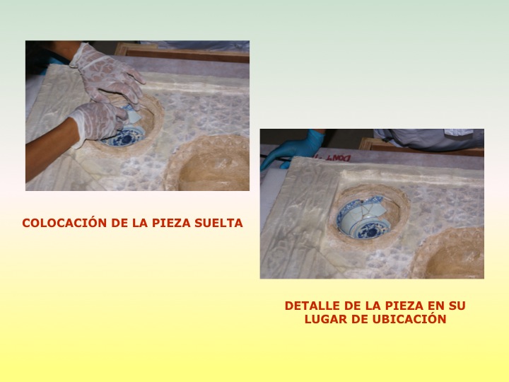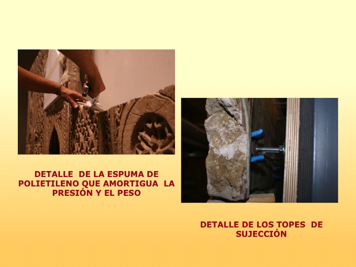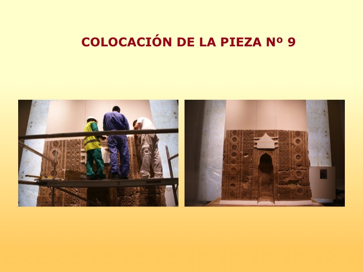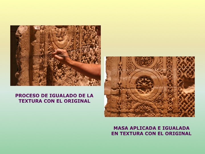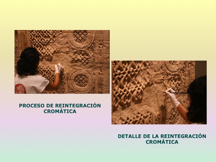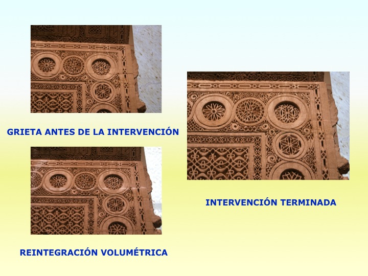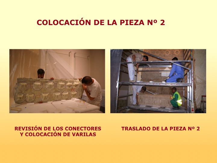 El mihrab se recompone mediante un sistema de varillas, conectores, tuercas, arandelas, topes y tensores, diseñado para que cada elemento soporte su propio peso y quede anclado de forma segura pero reversible. La hornacina actúa como pieza matriz, seguida del resto de módulos hasta completar el frente arquitectónico completo. Se refuerzan las uniones con fibra de vidrio y resina, y se ejecuta una nueva moldura de base de escayola que estabiliza el apoyo inferior.