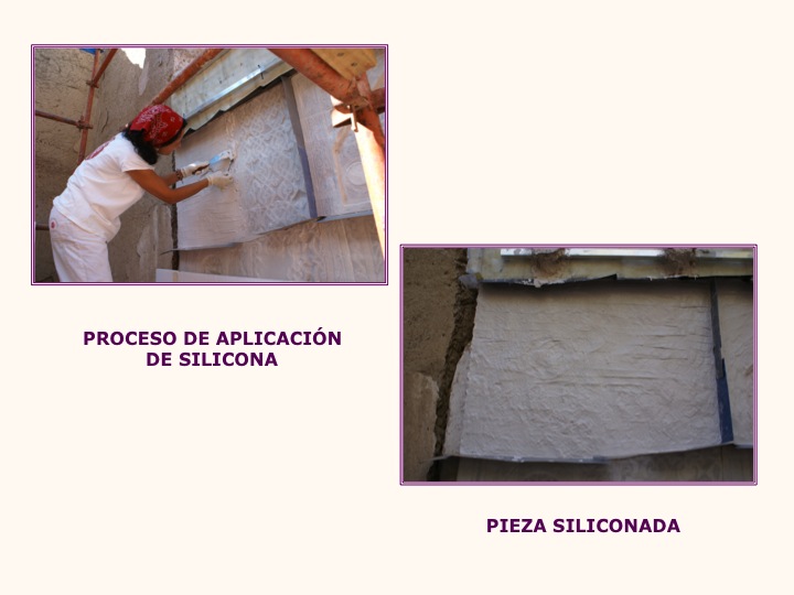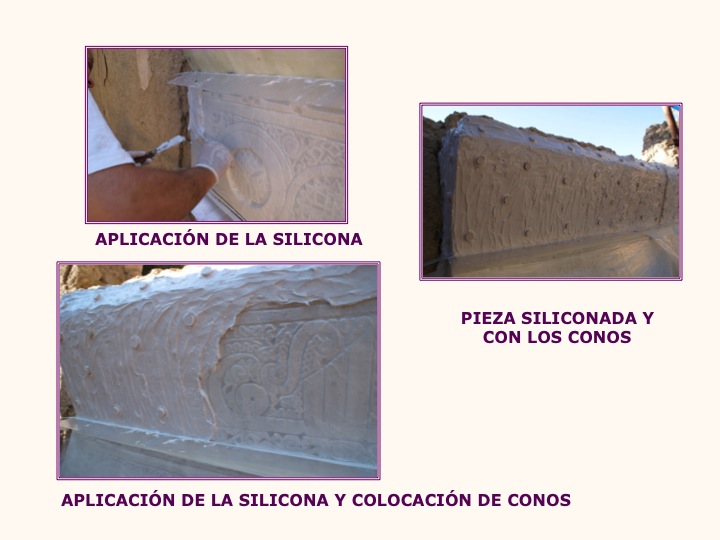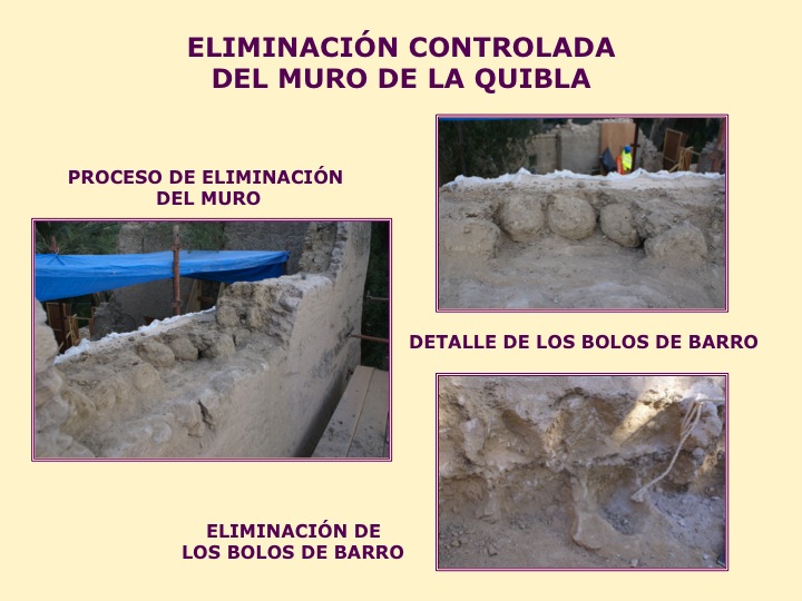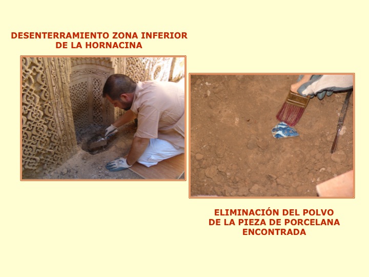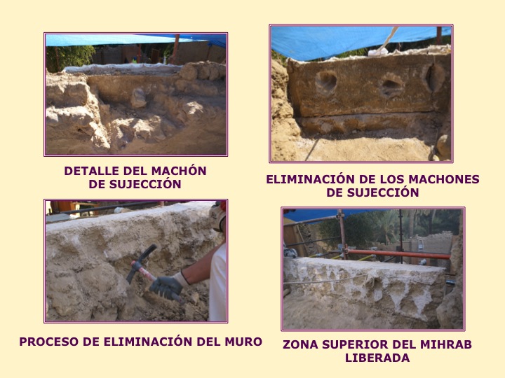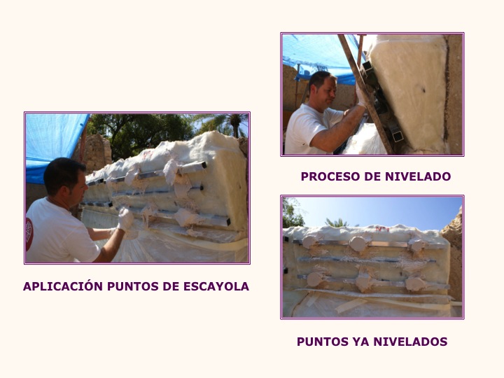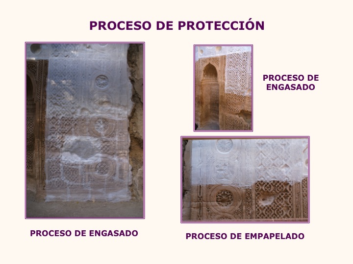 La Fase 1 de la intervención de El Barco® afronta un reto inédito: es la primera vez que se traslada una obra de arte íntegramente de yeso de estas dimensiones. Para hacerlo posible fue necesario diseñar una metodología específica de conservación, arranque y traslado. Sobre el muro de la quibla se acometió el desescombro y el desenterramiento de las zonas ocultas; después, una limpieza estratificada fue liberando arabescos y marcas incisas de diseño y escritura, mientras aparecían restos de policromía y pequeños fragmentos cerámicos. En paralelo, se consolidó la yesería, se protegió con engasado y empapelado, y se reforzó el conjunto mediante siliconado, resina y fibra de vidrio, reglas de nivelación y puntos de escayola.